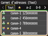 <Menu> <Réglages fax> <Réglages de transfert> <Activer réglages de transfert> <Activé>  Sélectionnez le destinataire de transfert dans le carnet d'adresses