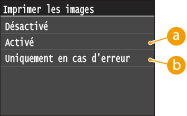 <Menu> <Réglages fax> <Réglages de transfert>  <Imprimer les images>  Sélectionnez <Activé> ou <Uniquement en cas d'erreur>