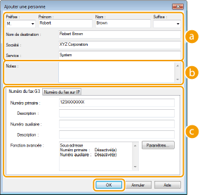 Saisissez le ou les numéros de fax. Il est possible d'insérer des tirets entre les chiffres. Si vous souhaitez ajouter des explications quant à l'utilisation des numéros de fax, par exemple "Domicile" ou "Bureau", saisissez-les dans [Description].