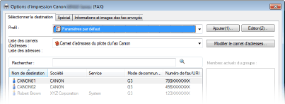 Cette section décrit la manière d'enregistrer les destinataires dans le carnet d'adresses pour les fax PC. Vous pouvez sélectionner des destinataires parmi ceux qui figurent dans le carnet d'adresses et former un groupe de destinataires (composition groupée), ce qui est un moyen utile d'envoyer un document à plusieurs destinataires à la fois.