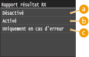 Sélectionnez cette option pour imprimer un rapport de réception seulement si une erreur se produit au cours de la réception du document.