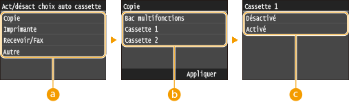 Sélectionnez <Activé> pour activer la sélection automatique de cassette à papier pour la source de papier que vous avez sélectionnée à l'écran précédent (