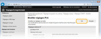 La case [Utiliser IPv6] doit être cochée pour configurer les réglages. Définition des adresses IPv6