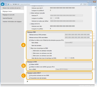 Le service DNS (Domain Name System) assure un service de résolution des noms qui associe un hôte (ou domaine) à une adresse IP. Configurez les réglages DNS, mDNS ou DHCP comme il convient. Notez que les procédures visant à configurer DNS diffèrent selon les adresses IPv4 et IPv6.