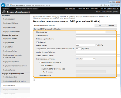 L'enregistrement de serveur LDAP est distinct, avec un enregistrement soit pour la recherche soit pour l'authentification. Pour utiliser un serveur pour la recherche de destinataire de fax et d'e-mails, enregistrez-le pour la recherche, et pour l'utiliser pour l'envoi d'authentification d'e-mail ou de fax, enregistrez-le pour l'authentification.