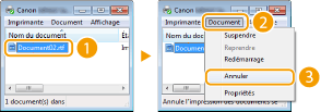 Annulation à partir d'une applicationDans certaines applications, un écran similaire à celui qui est représenté ci-dessous apparaît. Vous pouvez annuler l'impression en cliquant sur [Annuler].