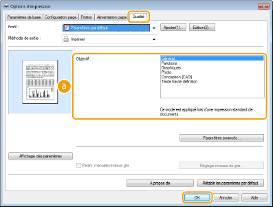 Pour définir des paramètres détaillés pour chaque élément sélectionné dans [Objectif], cliquez sur [Paramètres avancés]. Pour en savoir plus, cliquez sur [Aide], dans l'écran du pilote d'imprimante.