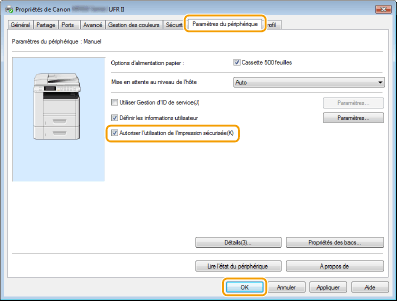 Cliquez sur l'onglet [Paramètres du périphérique], puis assurez-vous que la case [Autoriser l'utilisation de l'impression sécurisée] est cochée.