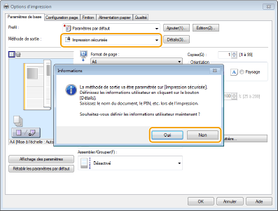 Sélectionnez [Impression sécurisée], dans [Méthode de sortie].