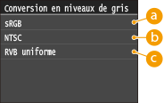 Vous pouvez sélectionner des méthodes pour convertir des valeurs de couleur en valeur de niveaux de gris lorsque vous imprimez des données d'impression de couleur.