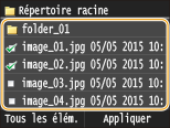 ![]() ![]() Lorsque vous sélectionnez <Date/Heure (Croissant)> ou <Date/Heure (Décroissant)>, le classement des fichiers s'effectue selon la date et de l'heure de modification des fichiers.
