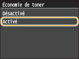 L'option <Activé> permet d'imprimer en mode d'économie de toner. Sélectionnez <Activé> si vous souhaitez vérifier la mise en page, ou autres caractéristiques graphiques, avant de procéder à l'impression définitive d'une tâche de grande ampleur.