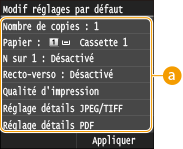 Sélectionnez le réglage à personnaliser en modifiant sa valeur par défaut.