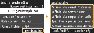 Si vous définissez plusieurs destinataires, le deuxième destinataire et les suivants doivent être enregistrés dans le carnet d'adresses ou sur le serveur LDAP. Vous ne pouvez définir en CC et en CCI que des destinataires enregistrés dans le carnet d'adresses. Pour utiliser le carnet d'adresses ou un serveur LDAP, vous devez préalablement exécuter la procédure d'enregistrement.