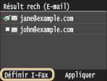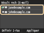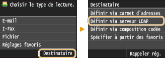 Si votre bureau dispose d'un serveur LDAP, vous pouvez définir un destinataire au moyen des informations utilisateur qui y sont stockées. Accédez au serveur LDAP à l'aide de l'appareil pour rechercher les informations utilisateur, puis définissez-les en tant que destinataires.