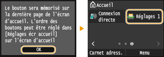 Si vous sélectionnez <Oui>, un message s'affiche. Consultez le message, puis appuyez sur <OK>. La combinaison de paramètres enregistrée s'ajoute à l'écran Accueil sous la forme d'un bouton de raccourci.