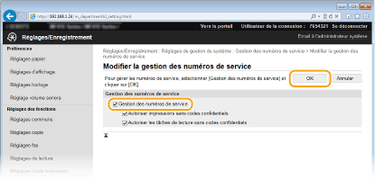 Cochez cette case pour afficher l'écran contextuel [Confirmez l'ID de service et le PIN] à chaque fois que vous lancez une impression ou une télécopie depuis un ordinateur. [Authentifier l'ID de service/le PIN du périphérique]