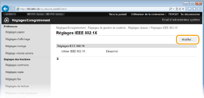 Vous pouvez également activer ou désactiver l'authentification IEEE 802.1X à partir de <Menu>, dans l'écran Accueil. Réglages IEEE 802.1X