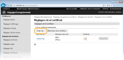 Il est impossible de supprimer une paire de clés en cours d'utilisation, par exemple lorsque "[TLS]" ou "[IEEE 802.1X]" s'affiche sous [Utilisation de la clé]. Dans ce cas, désactivez la fonction ou remplacez la paire de clés avant de la supprimer.