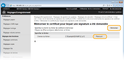 Cliquez sur [Parcourir], spécifiez le fichier associé à la demande de signature de certificat et cliquez sur [Mémoriser].