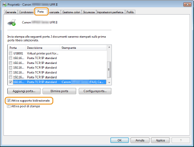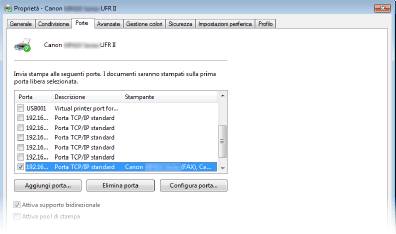 Se si utilizza una connessione di rete e si è modificato l'indirizzo IP della macchinaSe [Descrizione] per la porta selezionata è [Canon MFNP Port], e la macchina e il computer si trovano nella stessa subnet, allora la connessione verrà mantenuta. Non è necessario aggiungere una nuova porta. Se è impostato [Porta TCP/IP standard], è necessario aggiungere una nuova porta. Configurazione delle porte di stampa