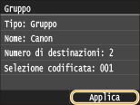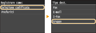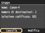 È possibile unire più selezioni in gruppi. È possibile registrare fino a 299 destinazioni (100 destinazioni per le e-mail) per un gruppo. Dopo la registrazione di un gruppo, è possibile modificarlo o eliminarlo.