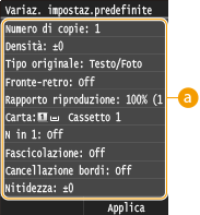 . Se si modificano queste impostazioni predefinite per farle corrispondere alle operazioni che si eseguono frequentemente, sarà possibile eliminare la necessità di configurare le stesse impostazioni ogni volta si eseguano copie.