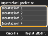 Se si desidera eliminare un'impostazione registrata, toccare <Copia>  <Impostazioni preferite>  <Cancella>  Selezionare le impostazioni  <Sì>  <Sì>.