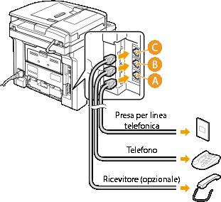 Collegare il cavo telefonico incluso alla presa per linea telefonica sulla macchina (