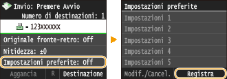Per modificare o eliminare impostazioni registrate, passare a <Fax>  <Impostazioni preferite>  <Modif./Cancel.>  <Modifica> o <Cancella> e quindi attenersi alle istruzioni seguenti.