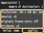 È possibile registrare fino a 18 combinazioni di impostazioni fax utilizzate frequentemente. Quando occorre, le impostazioni registrate possono essere richiamate rapidamente, eliminando la necessità di effettuare ogni volta le stesse impostazioni, ad esempio per la scansione di un originale fronte-retro, da inviare a 5 destinazioni, con impostazione della nitidezza. Inoltre è possibile visualizzare le impostazioni come pulsanti di scelta rapida nella schermata Schermata principale.