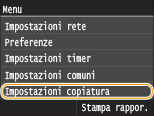 Tutte le impostazioni della copia sono elencate con una breve descrizione. Le impostazioni predefinite sono contrassegnate con una croce (
