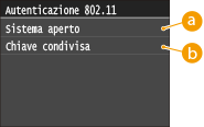 Quando si collega a una LAN wireless la macchina rileva un errore di autenticazione se la chiave di autenticazione condivisa è impostato sul router wireless. Se ciò accade, la macchina modifica automaticamente l'impostazione su <Chiave condivisa> e riprova a connettersi.