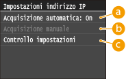 ![]() Se viene visualizzato <On>, toccare <Acquisizione automatica> e impostare sia <Selezione protocollo> e sia <IP automatico> su <Off>.