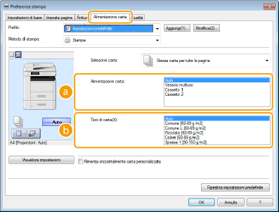 L'alimentazione carta viene selezionata automaticamente in base al tipo e al formato carta specificati per la stampa e alle impostazioni configurate nella macchina.