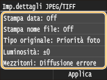 / per regolare la luminosità e toccare <Applica>.<Luminosità> non è disponibile per stampare file TIFF che non hanno compressione JPEG.