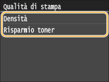 / , quindi toccare <Applica>. Notare che se <Risparmio toner> è impostato a <On>, non è possibile impostare questo elemento.![]() ![]() Regolazione fine della densità del toner