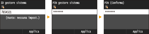 ![]() Sulla MF419x / MF418x, l'ID gestore sistema e il PIN predefiniti sono "7654321". È consigliabile cambiare questa impostazione per maggiore sicurezza.
