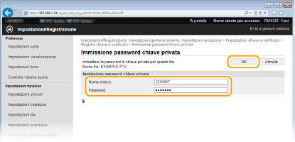 [Password] Immettere fino a 24 caratteri alfanumerici per la password della chiave privata impostata per il file da registrare.