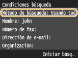 El nombre, los números de fax, las direcciones de e-mail, los nombres de organizaciones y la unidad de la organización son criterios disponibles para buscar destinos.