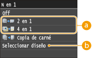 (Ampliación o reducción), pero es posible que los lados del documento no se copien si la aumenta.<2 en 1>/<4 en 1> no estará disponible cuando se utilice <Borrar marco> o <Copia de carné>.