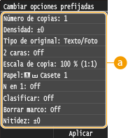 La configuración predeterminada es la configuración que aparece al encender el equipo, o al pulsar