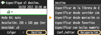 Puede seleccionar un destino entre los tres últimos destinos utilizados. Cuando se especifica un destino utilizado anteriormente, el equipo también configura las mismas opciones de fax utilizadas la última vez que se enviaron documentos a dicho destino, como por ejemplo la densidad.
