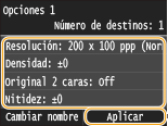 Podrá registrar hasta 18 combinaciones de opciones de fax que utilice con frecuencia. Podrá ver rápidamente las opciones registradas cuando sea necesario, eliminando la necesidad de configurar las mismas opciones cada vez, como puede ser la "lectura de un original a doble cara, envío de este a 5 destinos y ajuste de la nitidez". También podrá visualizar las opciones como botones de acceso directo en la pantalla Inicio.
