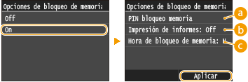 Para guardar los documentos recibidos en la memoria, establezca <Opciones de bloqueo de memoria> en <On>. También puede especificar ajustes opcionales como la opción de seguridad, que requiere una contraseña para poder desbloquear la función, y la opción de tiempo, que especifica el periodo de tiempo del día durante el cual se almacenarán en la memoria los documentos recibidos.