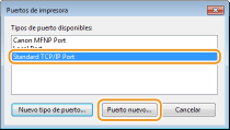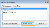 Seleccione [Canon MFNP Port] en [Tipos de puerto disponibles] y haga clic en [Puerto nuevo].