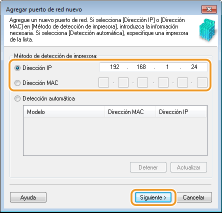 Es un puerto que permite detectar automáticamente la dirección IP del equipo. Incluso si se cambia la dirección IP del equipo, la conexión se mantiene siempre y cuando el equipo y el ordenador estén en la misma subred. No es necesario añadir un puerto nuevo cada vez que cambie la dirección IP. Si utiliza el equipo en un entorno IPv4, debería seleccionar este tipo de puerto.