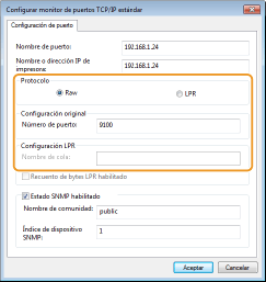 En [Tipo de protocolo], seleccione [RAW] o [LPR] y cambie el [Número de puerto].