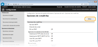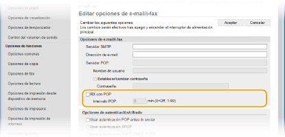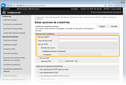 Utilice la IU remota para configurar las opciones detalladas de envío y recepción, como pueden ser las opciones para utilizar el equipo para enviar y recibir I-Faxes y las opciones para la autenticación POP y el cifrado de la comunicación antes de enviar e-mails o I-Faxes. Póngase en contacto con su proveedor o administrador de red para obtener la configuración necesaria.