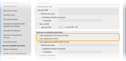 La autenticación de POP antes de SMTP evita que usuarios no autorizados puedan utilizar el e-mail y los I-Faxes mediante una autenticación en el servidor POP3.